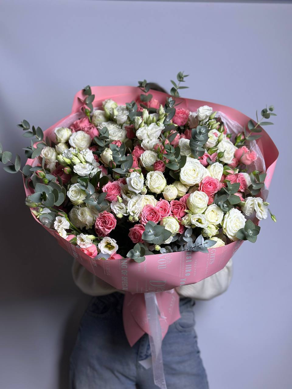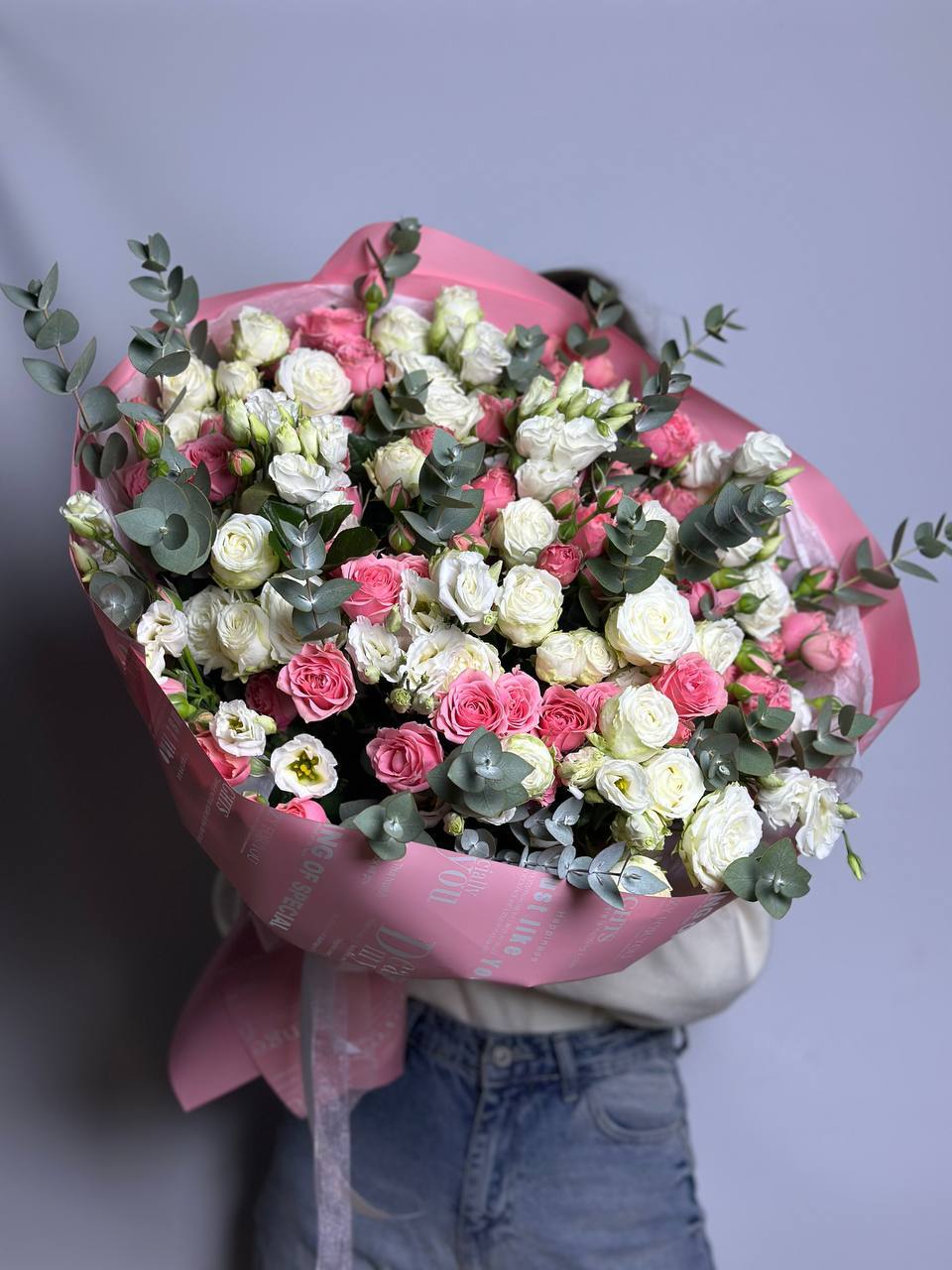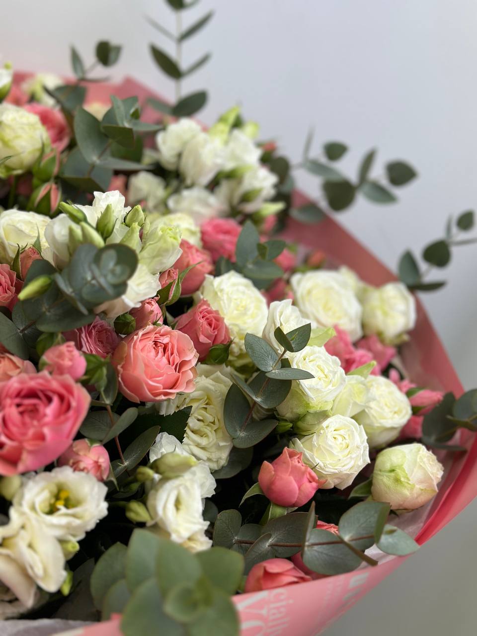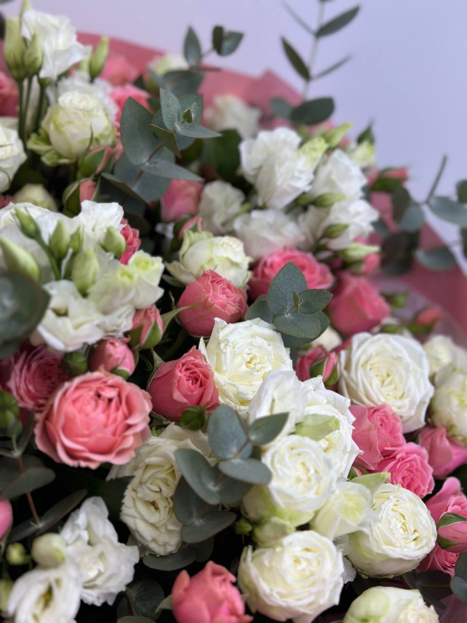 Нежное сочетание кустовых роз, эустомы и эвкалипта. Хороший выбор, чтобы порадовать близкого вам человека!