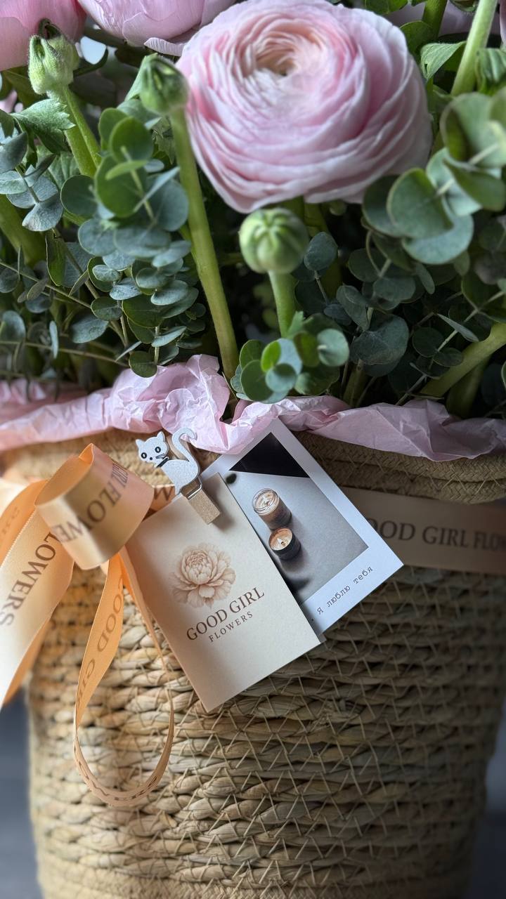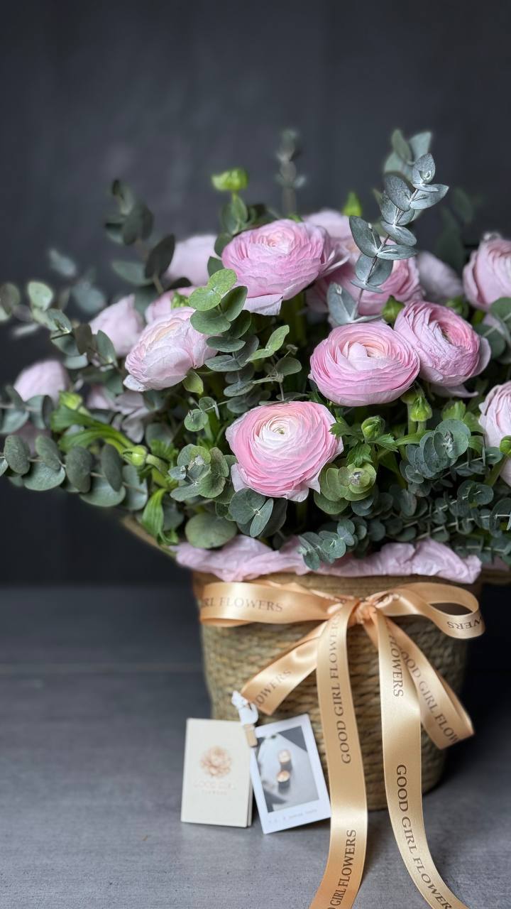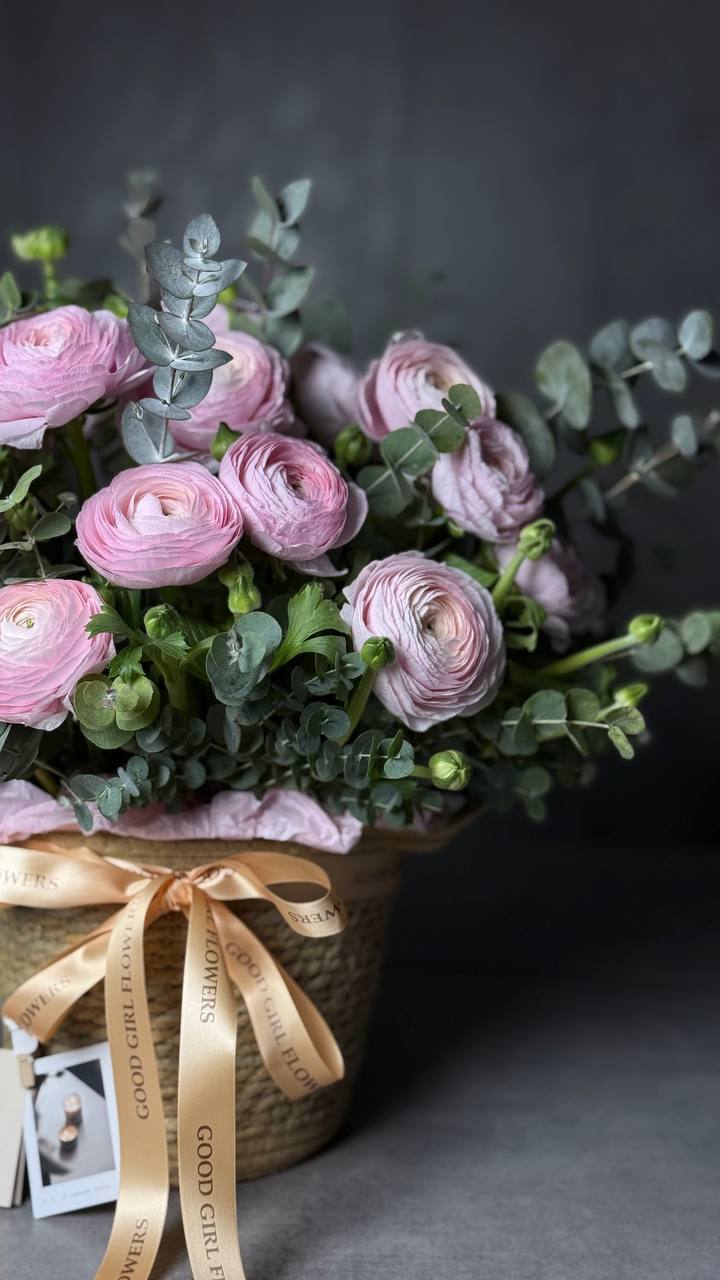 Невероятно красивая плетенная корзинка с ранункулюсами и эвкалиптом подарит вам улыбку и создаст уют в вашем доме. Не отказывай себе в удовольствии смотреть каждый день на эту шикарную композицию!